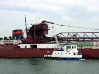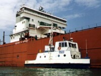 To some the Ojibway is an awkward looking boat, but she is easily recognized by the crane that sits behind her small pilothouse. The crane is used to lift large pallets of anything the ship may need from food to engine parts up to the the ship’s spar deck. The process of resupply is usually done as a vessel passes downbound, the Ojibway finds a spot to wait in the river as the ship begins to head closer, as the ship passes and slows down the Ojibway will come alongside and ties up to the ship. The pallets of supplies are then lifted up to the ship while such things as mail, garbage and dirty linens are taken back to be sent out, disposed of or cleaned. Sometimes members of the crew or visitors also get off and are taken back to the warehouse. After all supplies are aboard and anything needed to be taken off is on the Ojibway, the lines are cast and the ship continues on, and the Ojibway returns to the warehouse.