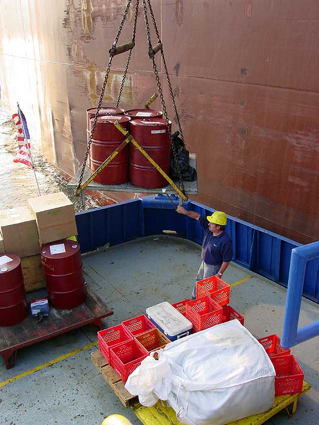 To some the Ojibway is an awkward looking boat, but she is easily recognized by the crane that sits behind her small pilothouse. The crane is used to lift large pallets of anything the ship may need from food to engine parts up to the the ship’s spar deck. The process of resupply is usually done as a vessel passes downbound, the Ojibway finds a spot to wait in the river as the ship begins to head closer, as the ship passes and slows down the Ojibway will come alongside and ties up to the ship. The pallets of supplies are then lifted up to the ship while such things as mail, garbage and dirty linens are taken back to be sent out, disposed of or cleaned. Sometimes members of the crew or visitors also get off and are taken back to the warehouse. After all supplies are aboard and anything needed to be taken off is on the Ojibway, the lines are cast and the ship continues on, and the Ojibway returns to the warehouse.