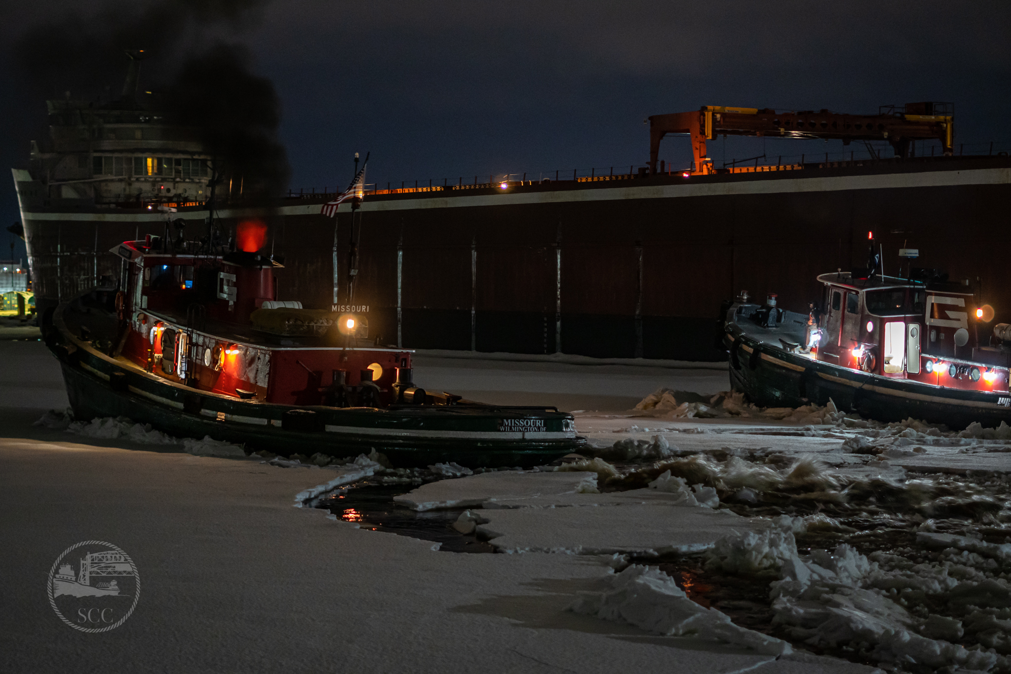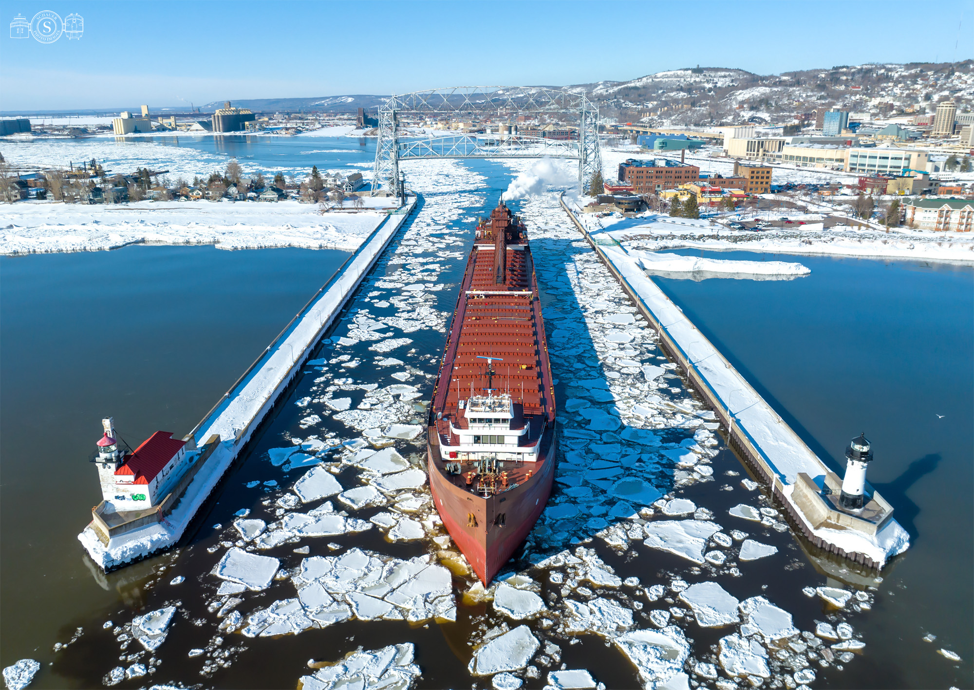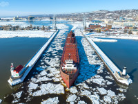 Our 2023 season began with Great Lakes Towing tugs Missouri and Kentucky departing their dock on Rice’s Point around 17:00 Wednesday evening to break a path to Lee A. Tregurtha and American Mariner wintering at Fraser Shipyards. The tug crews quickly discovered that the ice and snow pack was 20 inches or more thick in Howard’s Pocket; after 4 hours of ramming, they finally made it to American Mariner floating in drydock. The pair spent the rest of the night assisting the Mariner to the shiploader at CN #6. After that was done, the two tugs returned to Lee A. Tregurtha for their departure from Fraser Thursday morning. Lee A. Tregurtha departed under Duluth’s aerial bridge at 09:19 empty for Marquette. Just before the Tregurtha departed, US Coast Guard cutter Spar launched from Park Point for icebreaking duties; they departed through the Superior Entry at 12:35 and re-entered Duluth at 14:04.