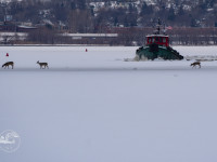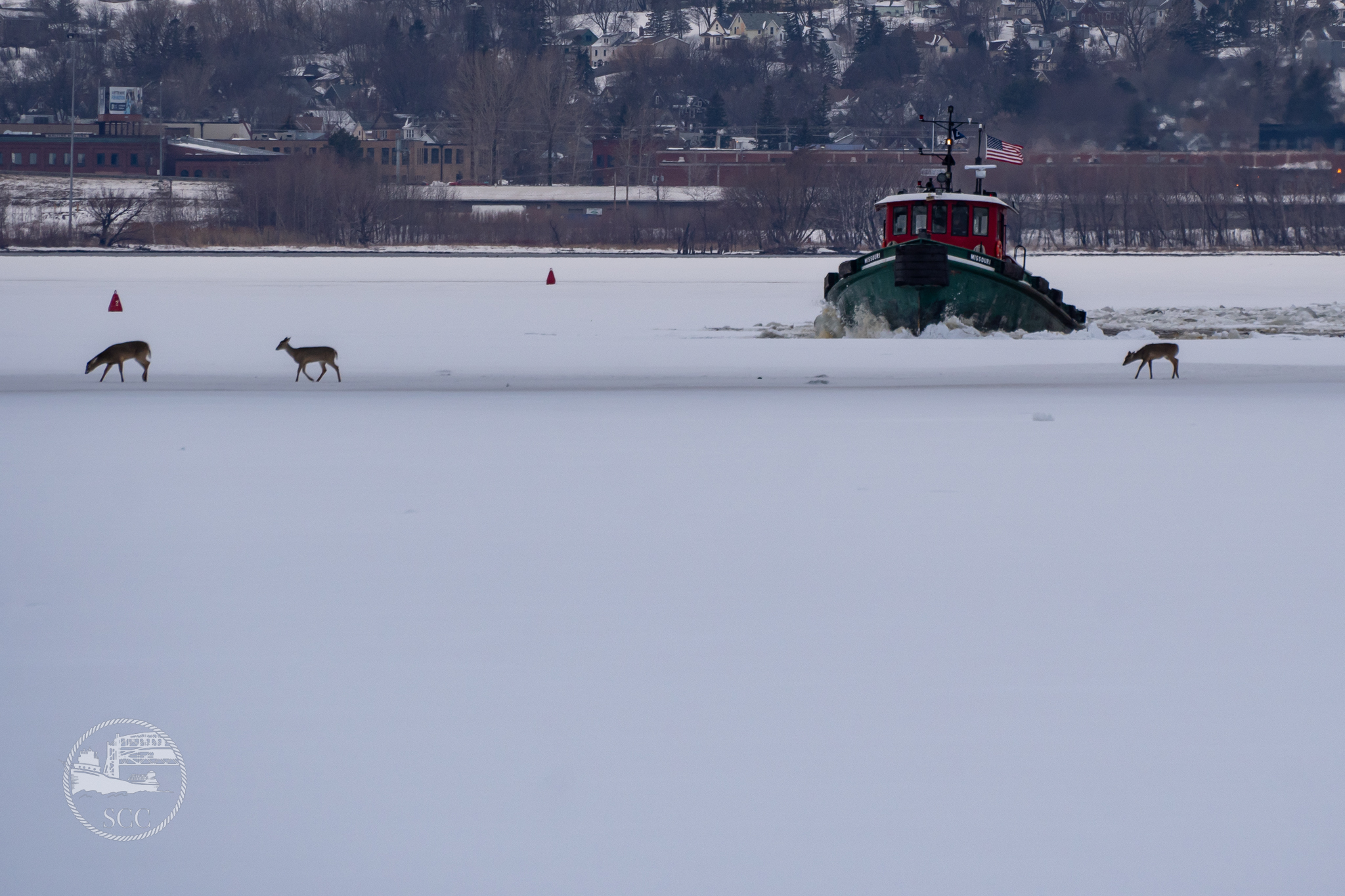 - G-tug Missouri approaches a herd of deer walking across the ice in Superior, WI. Scott Bjorklund image, March 22