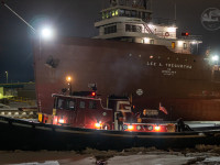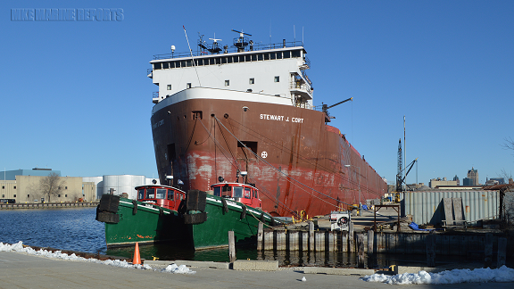 - Stewart J. Cort towers over a pair of G-tugs in Milwaukee, WI. MKE Marine Reports image, March 19